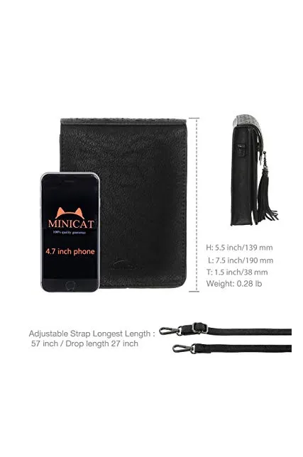 - ECO-Friendly: MINICAT Crossbody cell phone purse design with superior synthetic leather(have not any smell), which is ECO-Friendly, durable and soft. Purse inside is inlined with fuzzy material to avoid friction to the phone and causing any damage.(Dimension:Length 5.5in * Width 1.5in * Height 7.5in)