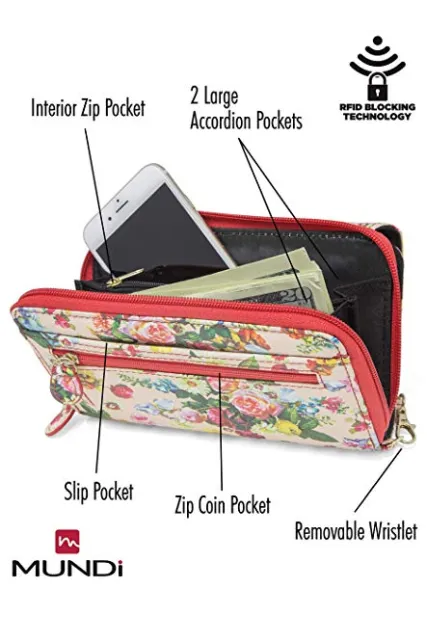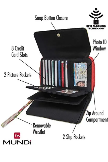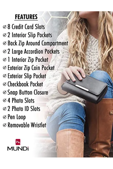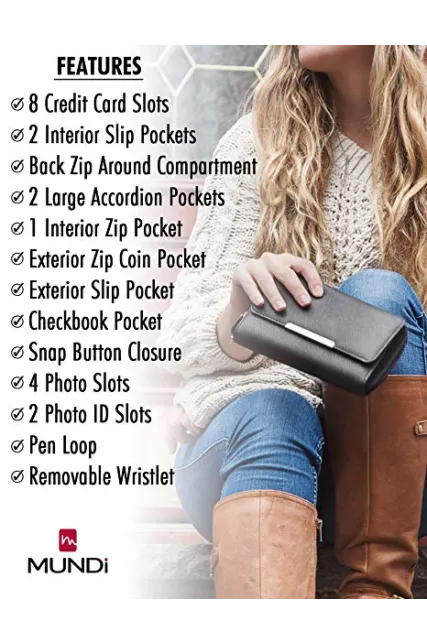 - KEEP ORGANIZED LOTS OF STORAGE – A removalable wristlet and 8 credit card pockets, 2 ID window’s, 4 picture pockets, 3 large horizontal pockets, a dedicated checkbook pocket with pen loop, 3 zipper pockets and 2 accordion pockets