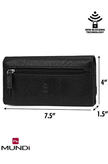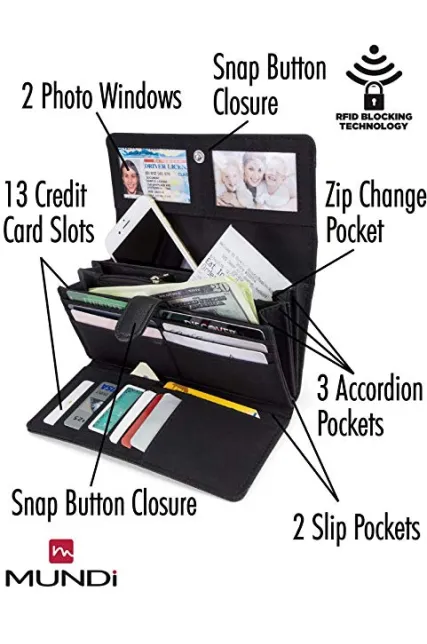 - RFID WALLET BLOCKING TECHNOLOGY - The Mundi File Master RFID blocking wallet clutch stops theft and electronic pick pocketing, protect your credit cards, debit cards, drivers license, bank cards or any other RFID enabled cards