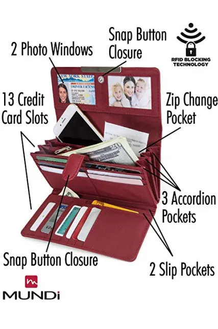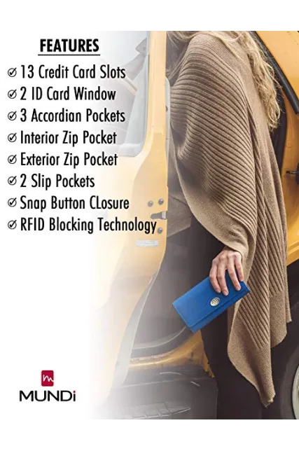 - RFID WALLET BLOCKING TECHNOLOGY - The Mundi File Master RFID blocking wallet clutch stops theft and electronic pick pocketing, protect your credit cards, debit cards, drivers license, bank cards or any other RFID enabled cards