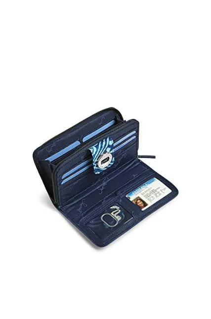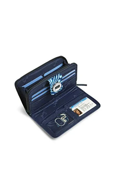 - PERFECTLY PLACED POCKETS: Our Signature RFID Turnlock Wallet measures 7.75 x 4.75 inches and features 1 zip exterior pocket with zip main pocket containing 12 card slips, bill pocket, slip pocket for your checkbook, and ID window