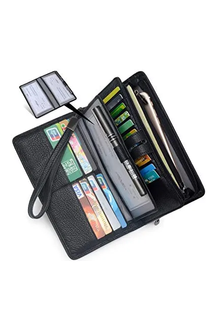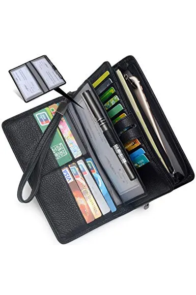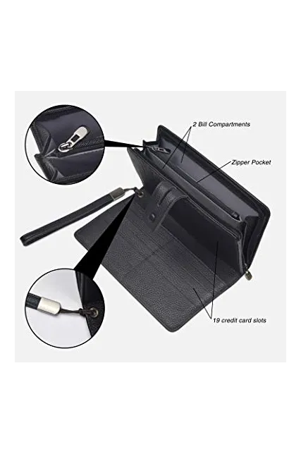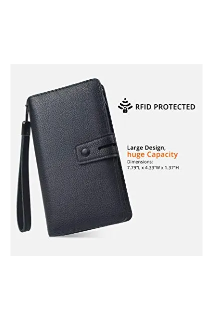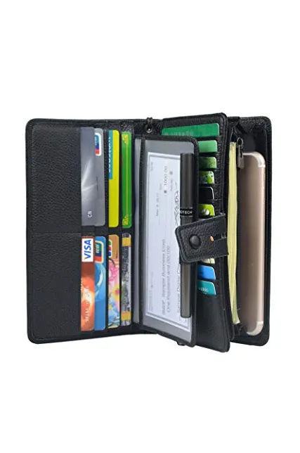 - LARGE CAPACITY OVERSIZE WALLET: 19 credit cards, 1 ID window,1 passport pocket (can fit 2-3 passports),a removable checkbook cover with 1 pen holder(can used as a checkbook wallet),An exterior zippered pocket reveals 2 additional pockets for storage cash, cellphone(can fit iPhone X XR XS Max 7/8 plus)and a zippered coin pouch. Dimensions: 7.79"L x 4.33"W x 1.37"H