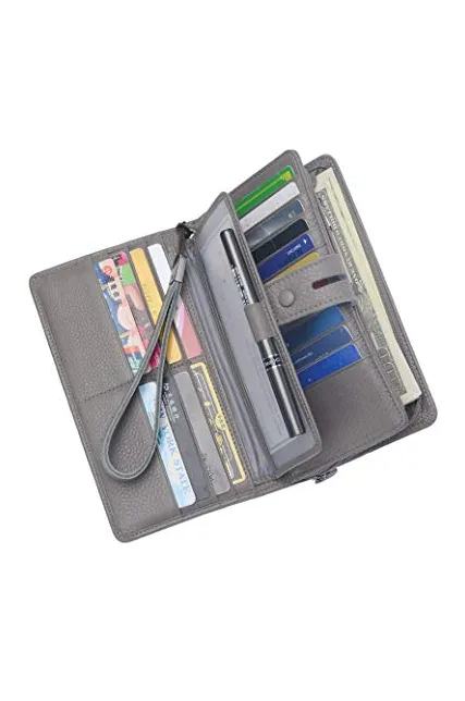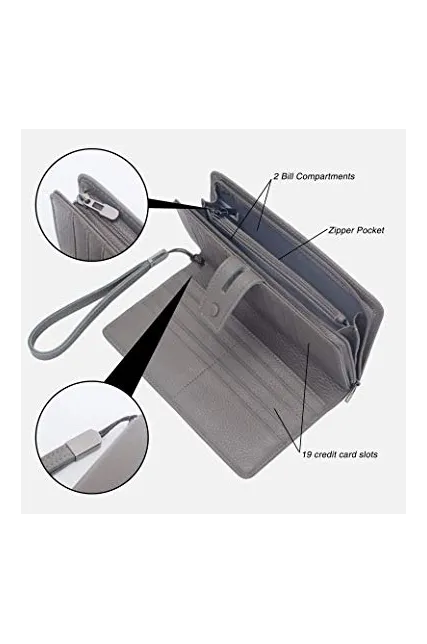 - LARGE CAPACITY OVERSIZE WALLET: 19 credit cards, 1 ID window,1 passport pocket (can fit 2-3 passports),a removable checkbook cover with 1 pen holder(can used as a checkbook wallet),An exterior zippered pocket reveals 2 additional pockets for storage cash, cellphone(can fit iPhone X XR XS Max 7/8 plus)and a zippered coin pouch. Dimensions: 7.79"L x 4.33"W x 1.37"H