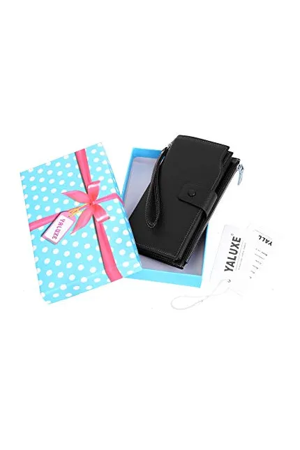 I cannot express how completely impressed I am with the quality of this wallet. I have nearly given up carrying handbags after 2 episodes of frozen shoulder so I like a wallet that will also hold my cell phone. I can say that this does, indeed, hold my iPhone 6 plus which also has an Otterbox case. Granted, it would fit better without the case, perfectly in fact, but it DOES fit into the space although I am not able to snap that spot closed when the phone is wearing the Otterbox case. If I had a smaller case, it would be perfect. I will probably search for a safe case that is smaller. So, back to the quality of this wallet. It arrived beautifully packaged in a lovely inner box with the wallet in a dust cover. Some have written of the leather being "shiny" but I feel that it has just a nice "luster" to it. It IS quality leather, soft, supple, and with the lovely smell of real leather. The wallet has a double snap closure so you may make adjustments if its fully loaded with cards. The zipper operates smoothly on the flip side of the wallet. It will hold bills and small amounts of change. I dont care to have much real change as the coins add weight. The interior of the wallet is well stitched and has 3 separate pockets underneath the spaces for cards. Im sure you could utilize these spaces for paper currency, receipts or to even tuck a checkbook in. All in all, this is a beautiful quality wallet and the price makes it even better. I have paid twice the price for much less. The only thing that could make this wallet better for me is if it came with a matching detachable wrist strap.