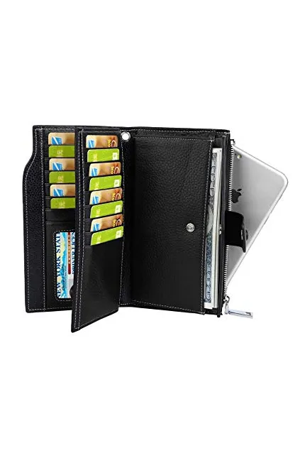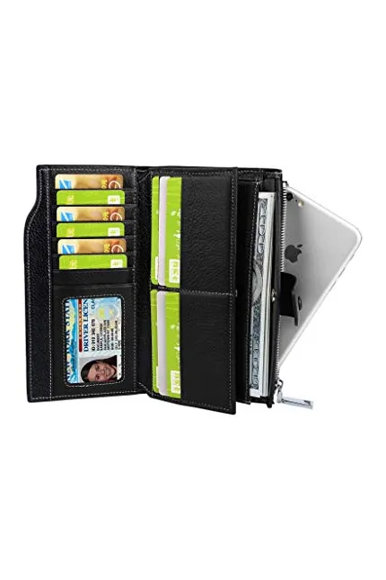 I really like this wallet. I was able to fit 19 credit cards / gift cards comfortably. Any more than that makes the wallet look a bit bulky, but it would still close. Also, a checkbook COULD slide into one of the sleeved pockets if necessary. My iPhone 6 also fits in both the zipper and button pockets, bonus!! My only complaint would be that it was a bit "shinier" leather than I had anticipated. Maybe I overlooked that in the product description section, but I thought it would be more of a soft, "worn" leather feel. Its definitely real leather, as it smells wonderful! On another note, I was pleasantly surprised with the ID insert pocket, as I was able to easily take my drivers license in and out of the pocket with no struggle. I also like the fact that if you dont want to attach the logo chain, you can leave it off and just have the little leather pull tab.