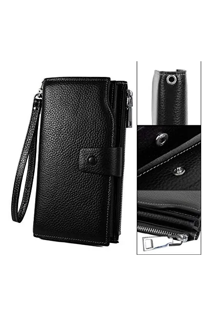 This wallet exceeded my expectations! It is amazing and worth every penny. Every bit of it inside and out is definately leather. There is not a flaw on it, it feels like silk in your hand. The stitching is perfect. The zipper section opens when the wallet is closed and my iPhone (5s) fits in there perfectly, and it is so accessible from there. The zipper is heavy duty, it has a beautiful and heavy duty pull on it, both appear to be gleeming brass. The picture ID does not have a plastic cover, (which usually sticks to the ID inside) instead, it is a netted material thats a little darker than the typical clear plastic, and I think it would make it more difficult for someone who happens to be around you to see your personal information. I can put 21 credit cards in the slots provided. I can put a check book in the wallet and it still closes easily. It does have a slight odor which I think will go away in time, it is not in any way anoying. I may order a second one to have when this one wears out many, many years from now. There is no wallet in the nicest stores in the USA to compaire with this wallet. It is made in China. I ordered the RFID blocking wallet (it comes with or without RFID) but no information in the wallet actually said it had RFID blocking made into it. This is my only concern. I emailed the seller to make sure it is RFID. This is the reply I received: Thank you so much for your inquiry and we really appreciated that, This is Paula to serve you, As the wallet you have receive was the RFID, here is the way to identify it, First: you can check the back of the gift box. you can see the ASIN: B01N2VHCDL, This is the code for amazon to distinguish the RFID. Secondly. in order to make the wallet look more artistic, so we was material the RFID blocking on the exterior of the wallet, when you open the surface of the wallet, you can see the RFID Material like the attachment, thank you so much. If you have any other question or problem, please dont be hesitate to contact us, thank you, Have a nice day!