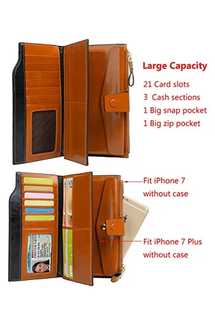 - ➤SUPER ORGANIZATION: 21 Card Holders, including 1 ID window; 3 cash compartments; 1 snap pocket and 1 zipper pocket. Zipper pocket can hold an iPhone 7 without case. Snap pocket can hold an iPhone 7 Plus without case.