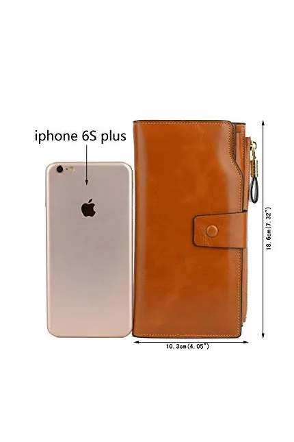 I cannot express how completely impressed I am with the quality of this wallet. I have nearly given up carrying handbags after 2 episodes of frozen shoulder so I like a wallet that will also hold my cell phone. I can say that this does, indeed, hold my iPhone 6 plus which also has an Otterbox case. Granted, it would fit better without the case, perfectly in fact, but it DOES fit into the space although I am not able to snap that spot closed when the phone is wearing the Otterbox case. If I had a smaller case, it would be perfect. I will probably search for a safe case that is smaller. So, back to the quality of this wallet. It arrived beautifully packaged in a lovely inner box with the wallet in a dust cover. Some have written of the leather being "shiny" but I feel that it has just a nice "luster" to it. It IS quality leather, soft, supple, and with the lovely smell of real leather. The wallet has a double snap closure so you may make adjustments if its fully loaded with cards. The zipper operates smoothly on the flip side of the wallet. It will hold bills and small amounts of change. I dont care to have much real change as the coins add weight. The interior of the wallet is well stitched and has 3 separate pockets underneath the spaces for cards. Im sure you could utilize these spaces for paper currency, receipts or to even tuck a checkbook in. All in all, this is a beautiful quality wallet and the price makes it even better. I have paid twice the price for much less. The only thing that could make this wallet better for me is if it came with a matching detachable wrist strap.