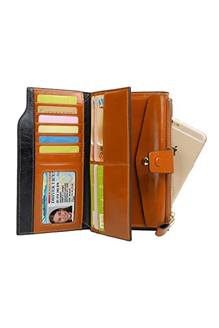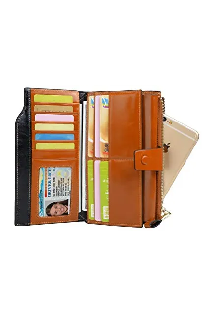 I really like this wallet. I was able to fit 19 credit cards / gift cards comfortably. Any more than that makes the wallet look a bit bulky, but it would still close. Also, a checkbook COULD slide into one of the sleeved pockets if necessary. My iPhone 6 also fits in both the zipper and button pockets, bonus!! My only complaint would be that it was a bit "shinier" leather than I had anticipated. Maybe I overlooked that in the product description section, but I thought it would be more of a soft, "worn" leather feel. Its definitely real leather, as it smells wonderful! On another note, I was pleasantly surprised with the ID insert pocket, as I was able to easily take my drivers license in and out of the pocket with no struggle. I also like the fact that if you dont want to attach the logo chain, you can leave it off and just have the little leather pull tab.