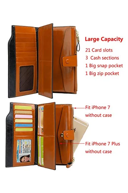 ➤SUPER ORGANIZATION: 21 Card Holders, including 1 ID window; 3 cash compartments; 1 snap pocket and 1 zipper pocket. Zipper pocket can hold an iPhone 7 without case. Snap pocket can hold an iPhone 7 Plus without case.
