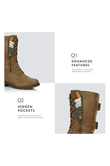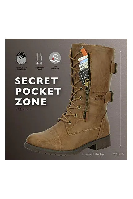 - RUGGEDLY CRAFTED --With the DailyShoes Women's Military Combat Boots with Pocket, you can easily walk on all types of terrains. The slip-resistant rubber sole has a special traction grip that will keep you on your feet on slippery floors, icy sidewalks and loose gravel. The boots are constructed out of heavy-duty vegan leather that resists wear and tear, making these boots perfect for work or play.