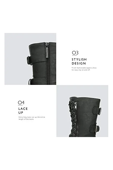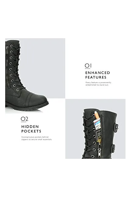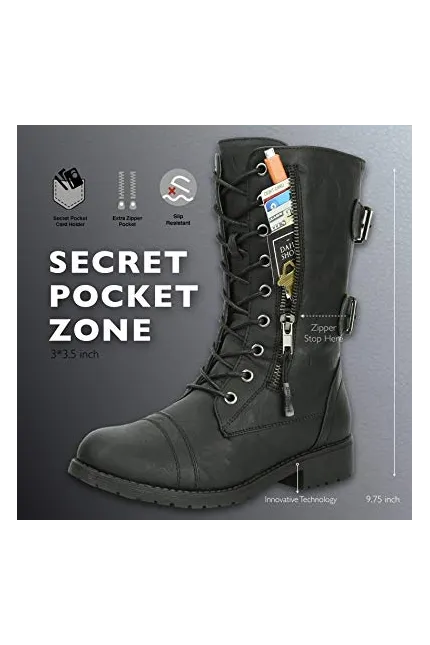 - RUGGEDLY CRAFTED --With the DailyShoes Women's Military Combat Boots with Pocket, you can easily walk on all types of terrains. The slip-resistant rubber sole has a special traction grip that will keep you on your feet on slippery floors, icy sidewalks and loose gravel. The boots are constructed out of heavy-duty vegan leather that resists wear and tear, making these boots perfect for work or play.