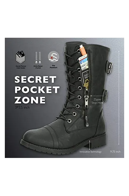 DailyShoes Women's Ankle Bootie High Lace up Military Combat Mid Calf Credit Card Knife Money Wallet Pocket Boots
