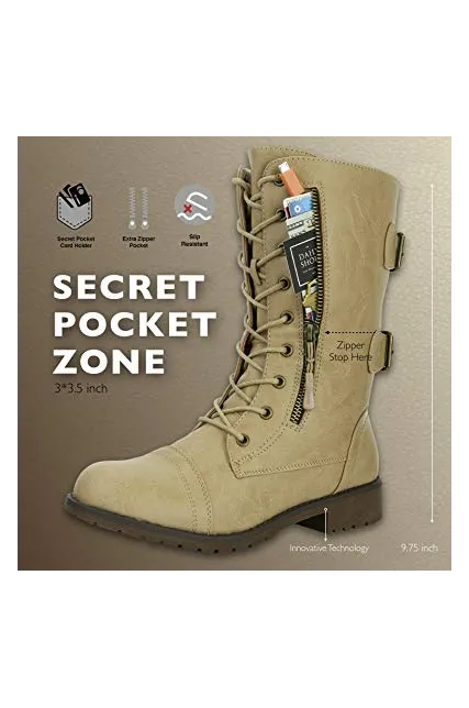 DailyShoes Women's Ankle Bootie High Lace up Military Combat Mid Calf Credit Card Knife Money Wallet Pocket Boots