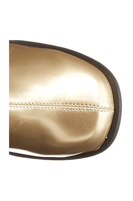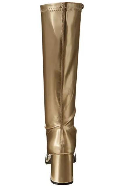 - Novelty go-go boot in glossy finish featuring chunky molded heel and split-toe stitching