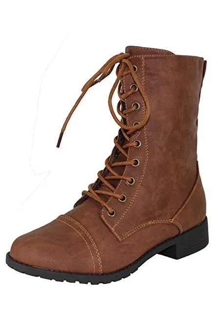 Forever Link Womens Round Toe Military Lace up Knit Ankle Cuff Low Heel Combat Boots