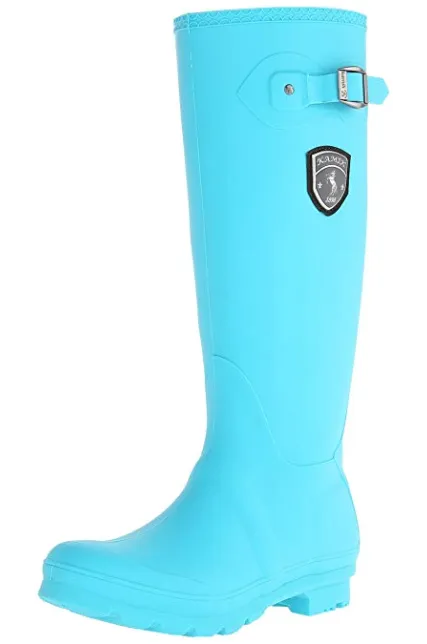 - Waterproof mid-calf rain boot with wingtip foot and logoed shield at shaft