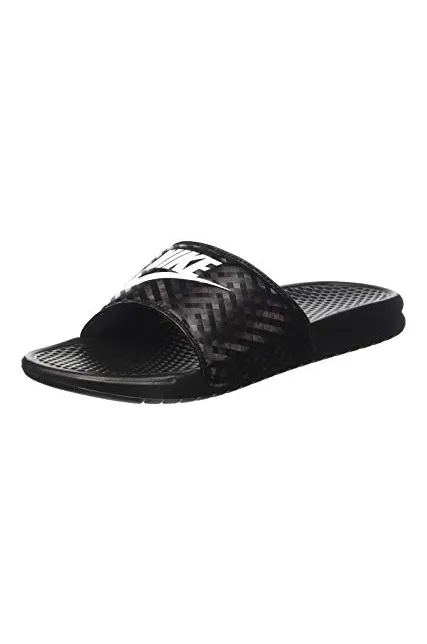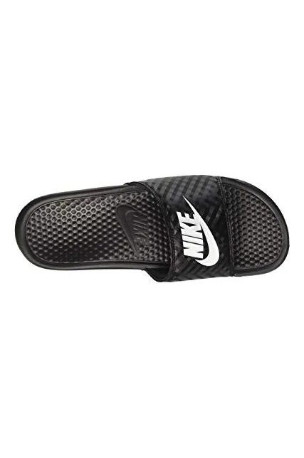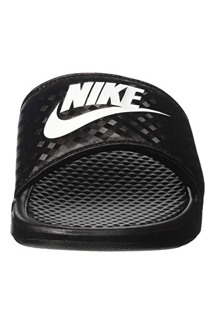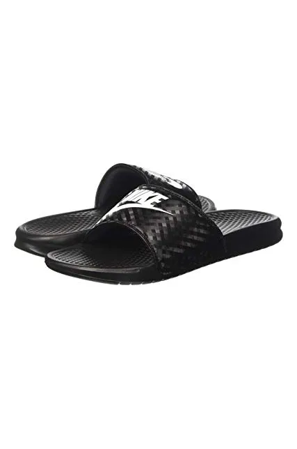 - WOMEN'S SLIDES: The Nike Benassi "Just Do It." sandal for women is designed with style and athleticism in mind. Nike corporate logo printed on top of women's slide sandal.