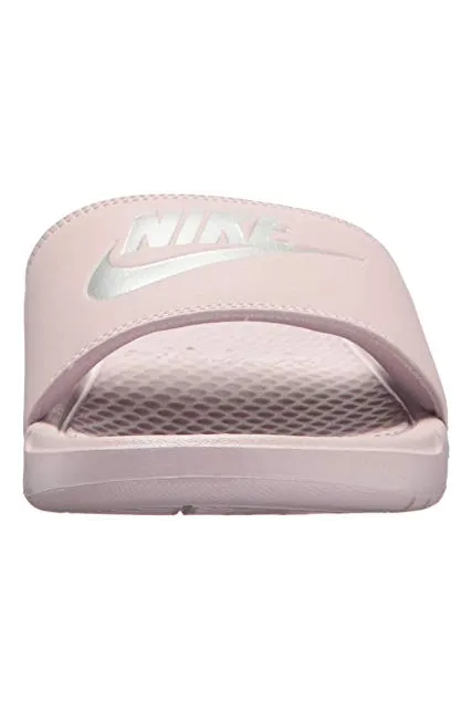 - WOMEN'S SLIDES: The Nike Benassi "Just Do It." sandal for women is designed with style and athleticism in mind. Nike corporate logo printed on top of women's slide sandal.