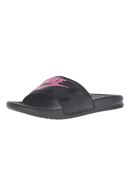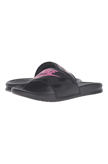 - WOMEN'S SLIDES: The Nike Benassi "Just Do It." sandal for women is designed with style and athleticism in mind. Nike corporate logo printed on top of women's slide sandal.