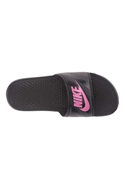 - WOMEN'S SLIDES: The Nike Benassi "Just Do It." sandal for women is designed with style and athleticism in mind. Nike corporate logo printed on top of women's slide sandal.