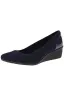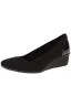 - Pointed-toe wedge pump featuring patent-texture heel counter and padded sport insole. Rubber traction outsole