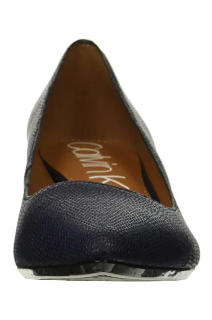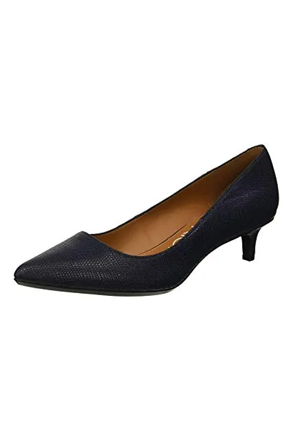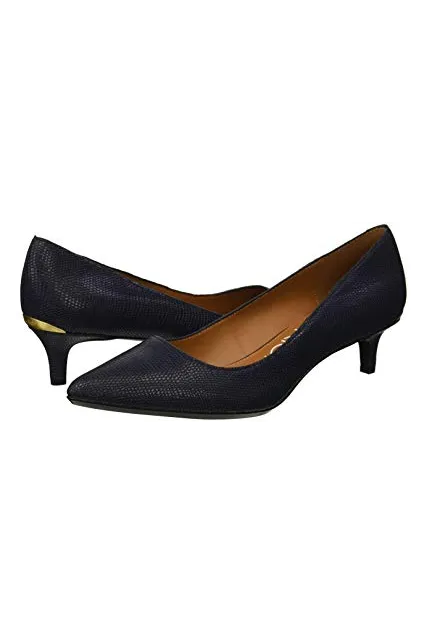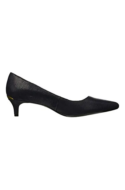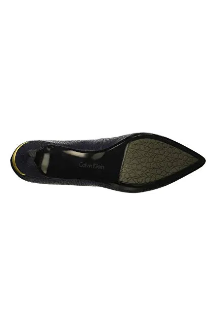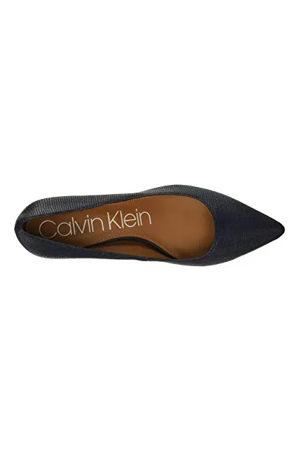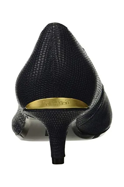 - STYLE AND DESIGN: Classic pointed toe pump with a 1.5 inch stiletto kitten heel for all day wear. Finished with a Calvin Klein logo plate at back heel.