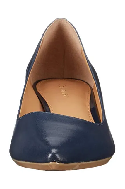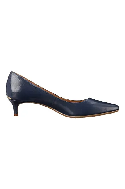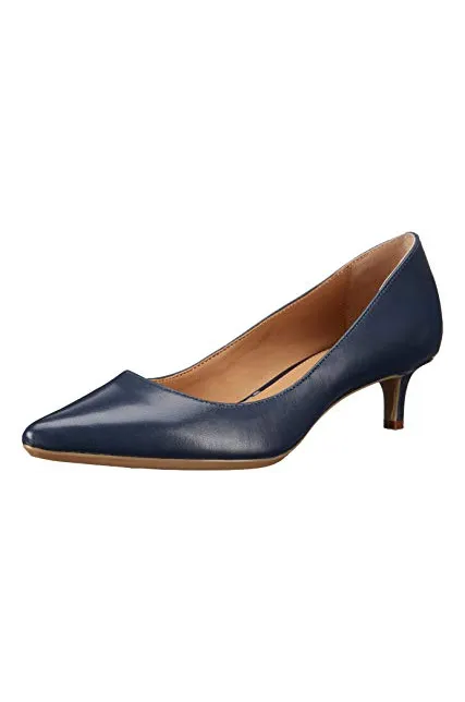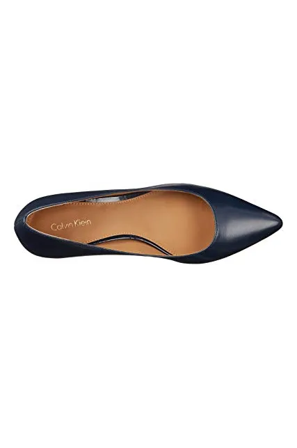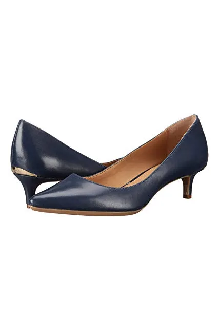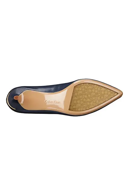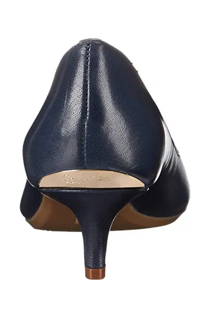 - STYLE AND DESIGN: Classic pointed toe pump with a 1.5 inch stiletto kitten heel for all day wear. Finished with a Calvin Klein logo plate at back heel.