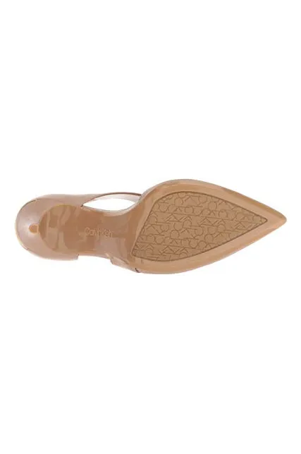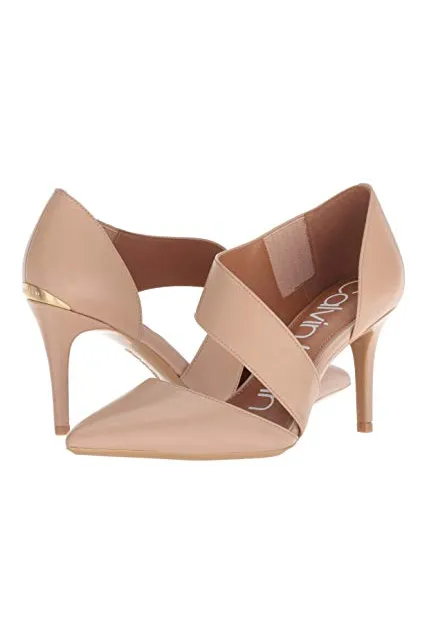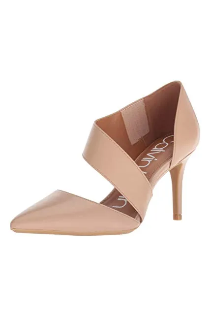 - STYLE AND DESIGN: Classic pointed toe pump with a 3 inch stiletto heel. Asymmetrical strap for optimal support and an extra touch of style. Finished with a Calvin Klein logo plate at back heel.