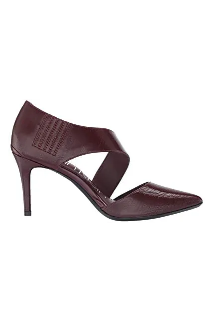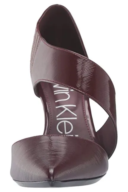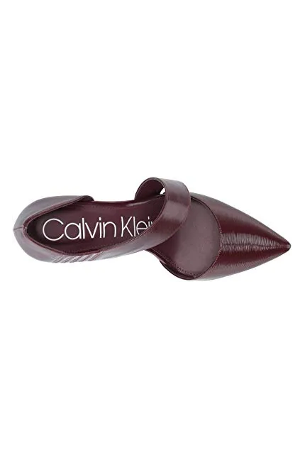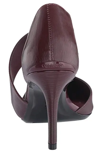 - STYLE AND DESIGN: Classic pointed toe pump with a 3 inch stiletto heel. Asymmetrical strap for optimal support and an extra touch of style. Finished with a Calvin Klein logo plate at back heel.