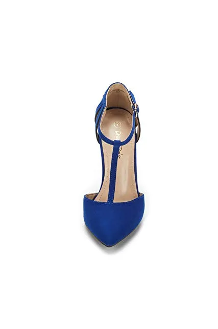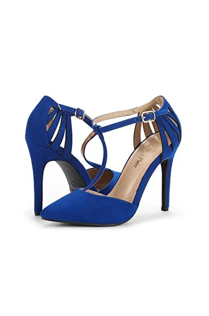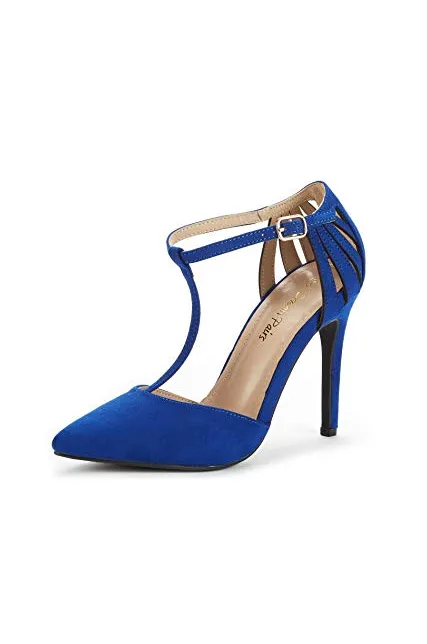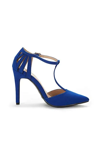 - Pointed toe on a T-strap silhouette.