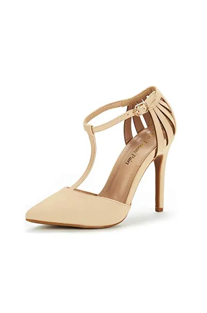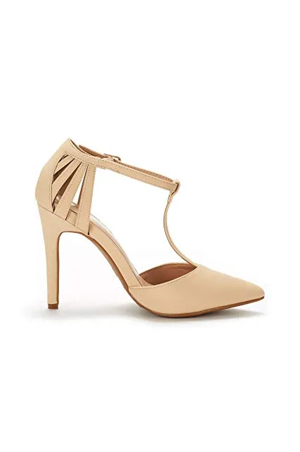 - Pointed toe on a T-strap silhouette.
