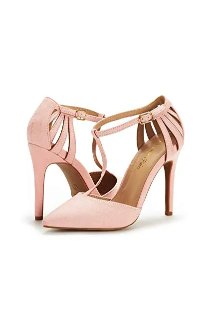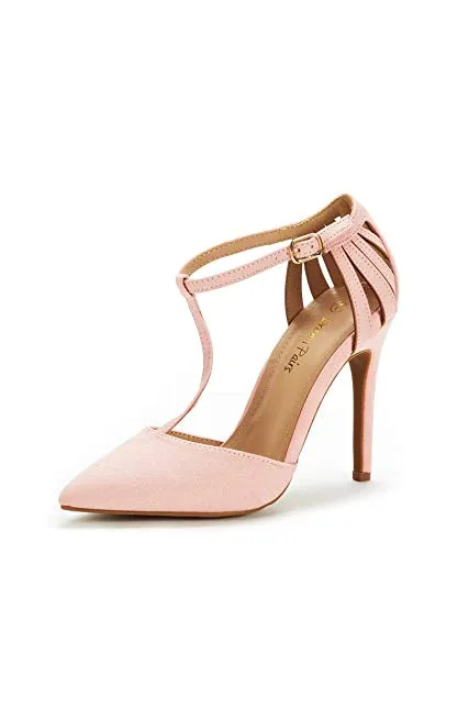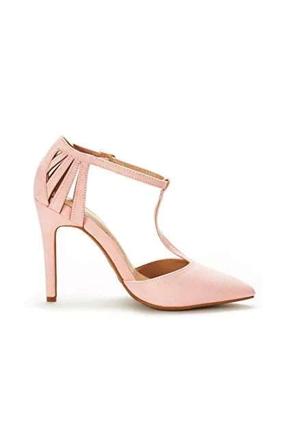 - Pointed toe on a T-strap silhouette.