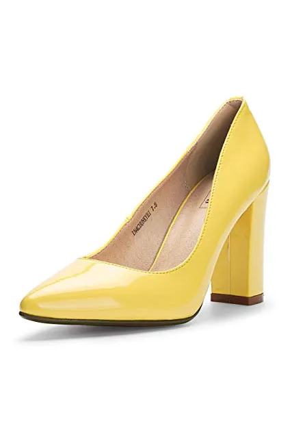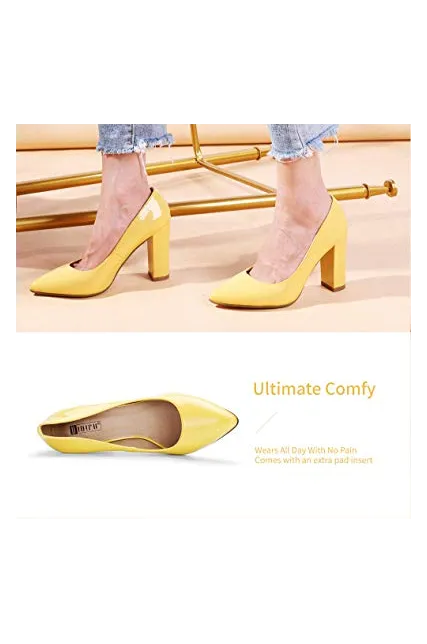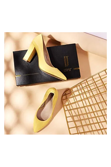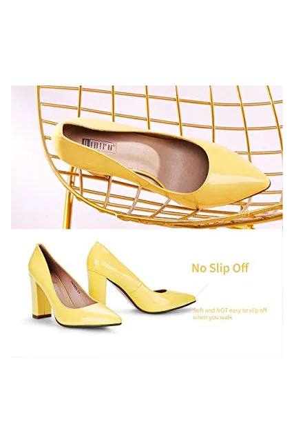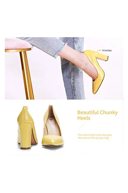 - SLIMMER PHYSIQUE: These pumps featuring slender silhouette with sexy pointed toe and high chunky heels give you a few inches boost to your frame and elongate your legs for elegance with every step.