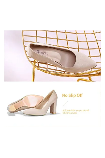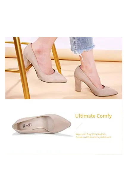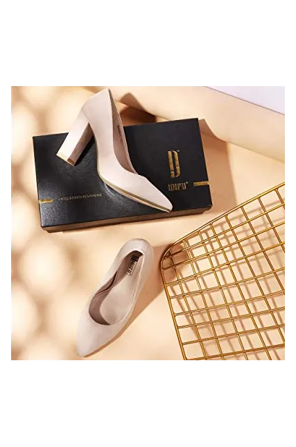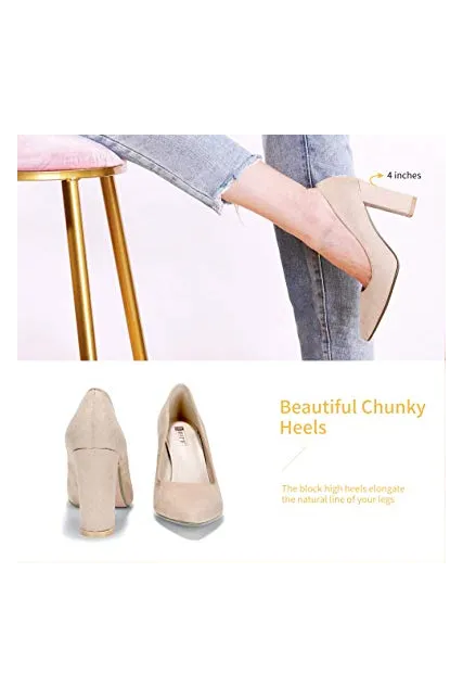 - SLIMMER PHYSIQUE: These pumps featuring slender silhouette with sexy pointed toe and high chunky heels give you a few inches boost to your frame and elongate your legs for elegance with every step.