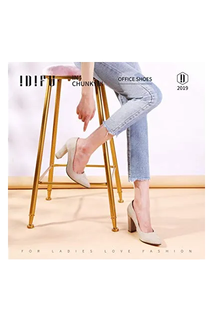 IDIFU Women's IN4 Chunky-HI Classic Closed Pointed Toe Pumps High Chunky Block Heels Dress Office Shoes