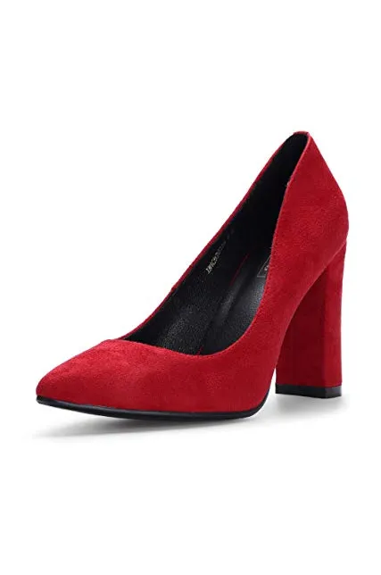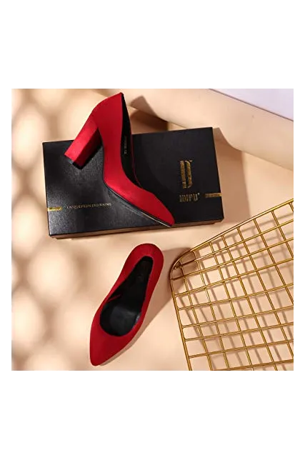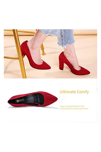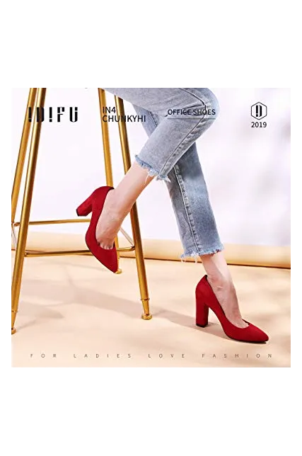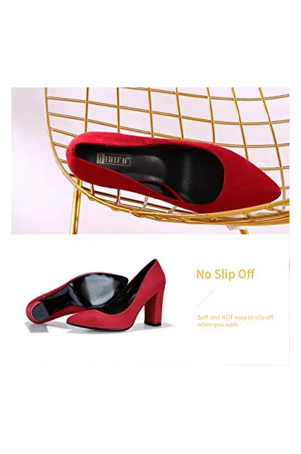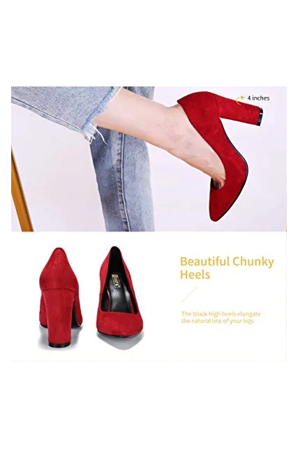 - SLIMMER PHYSIQUE: These pumps featuring slender silhouette with sexy pointed toe and high chunky heels give you a few inches boost to your frame and elongate your legs for elegance with every step.