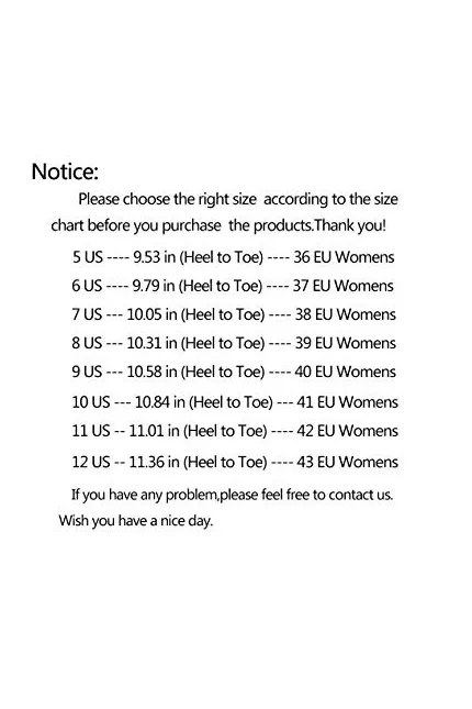 - Attention: The length of our shoes in the size chart refers to the inner length from the toe to heel. Please choose the right size referring to the size chart.Thank you!